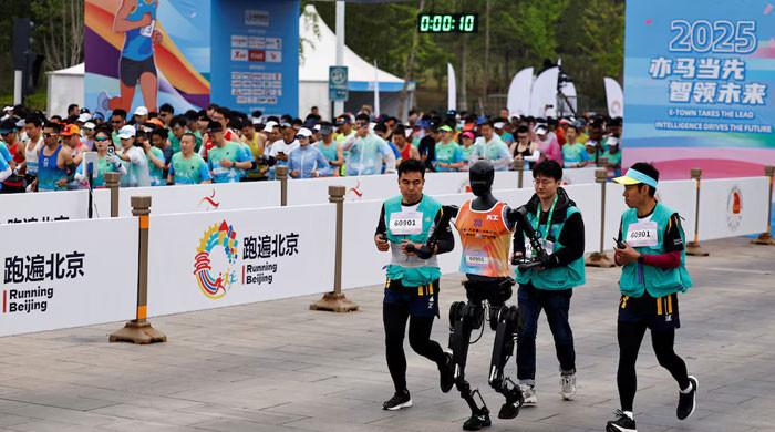 Engineers run with the humanoid robot “Tiangong” as it participates along with human runners in the…