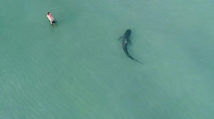 A tiger shark swims just a few metres from an unsuspecting bather at a Florida beach…