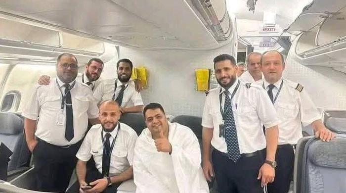 Amer Al Mahdi Mansour Al Gaddafi poses for photo alongside flight crew. — Facebook/Masroor Shaheen/File In…
