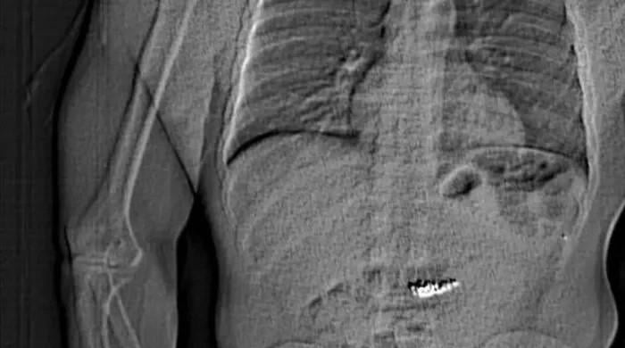 A handout image of an x-ray released by the Orlando Police showing an abdomen with a…
