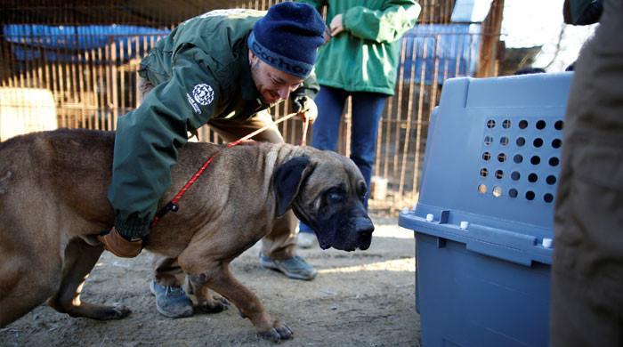 Rescue workers from Humane Society International rescue a dog at a dog meat farm in Wonju,…
