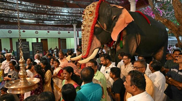 Hindu devotees gather around an adorned robotic elephant, newly donated by the Voice for Asian Elephants…